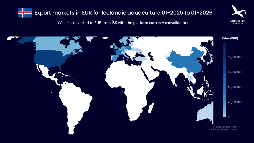 • Over the past year, the biggest Icelandic aquaculture export markets were the US, the Netherlands, France, China, and Denmark