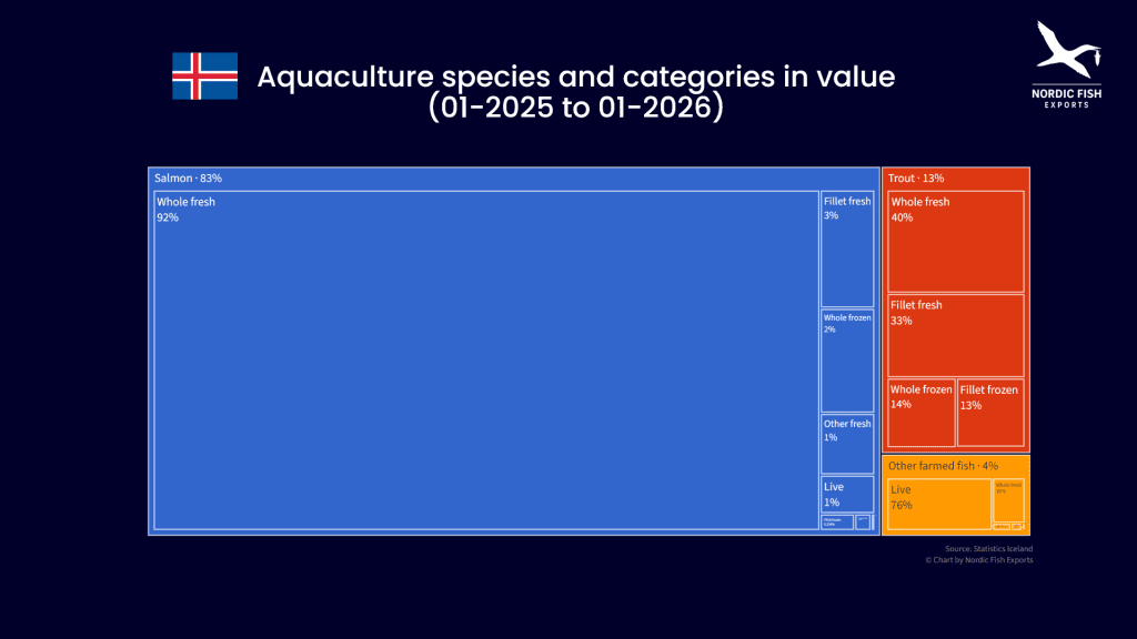 • In value, salmon (83%) and trout (13%) were the biggest aquaculture species in Iceland in the past year