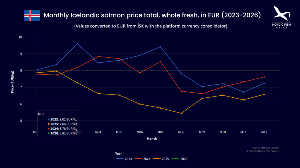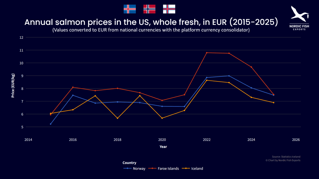 • Prices declined in 2025, and the annual salmon price in the US for Icelandic whole fresh was around 7€ compared to 7.5€ for Norway and the Faroes.
